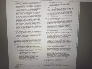 I am currently working on two papers on good governance in tax matters for EU countries and for non-EU (third) countries, and after doing a lot of reading on the topic, I just realized that I needed to go back to an article that I wrote in 2010, at the time that all developments of exchange of information started (Irma Johanna Mosquera Valderrama , EU and OECD Proposals for International Tax Cooperation: A New Road? Tax Notes International, Volume 59, Number 8 August 23, 2010). See picture below for the main elements of the 2010 Parliament Resolution as described in my 2010 article.