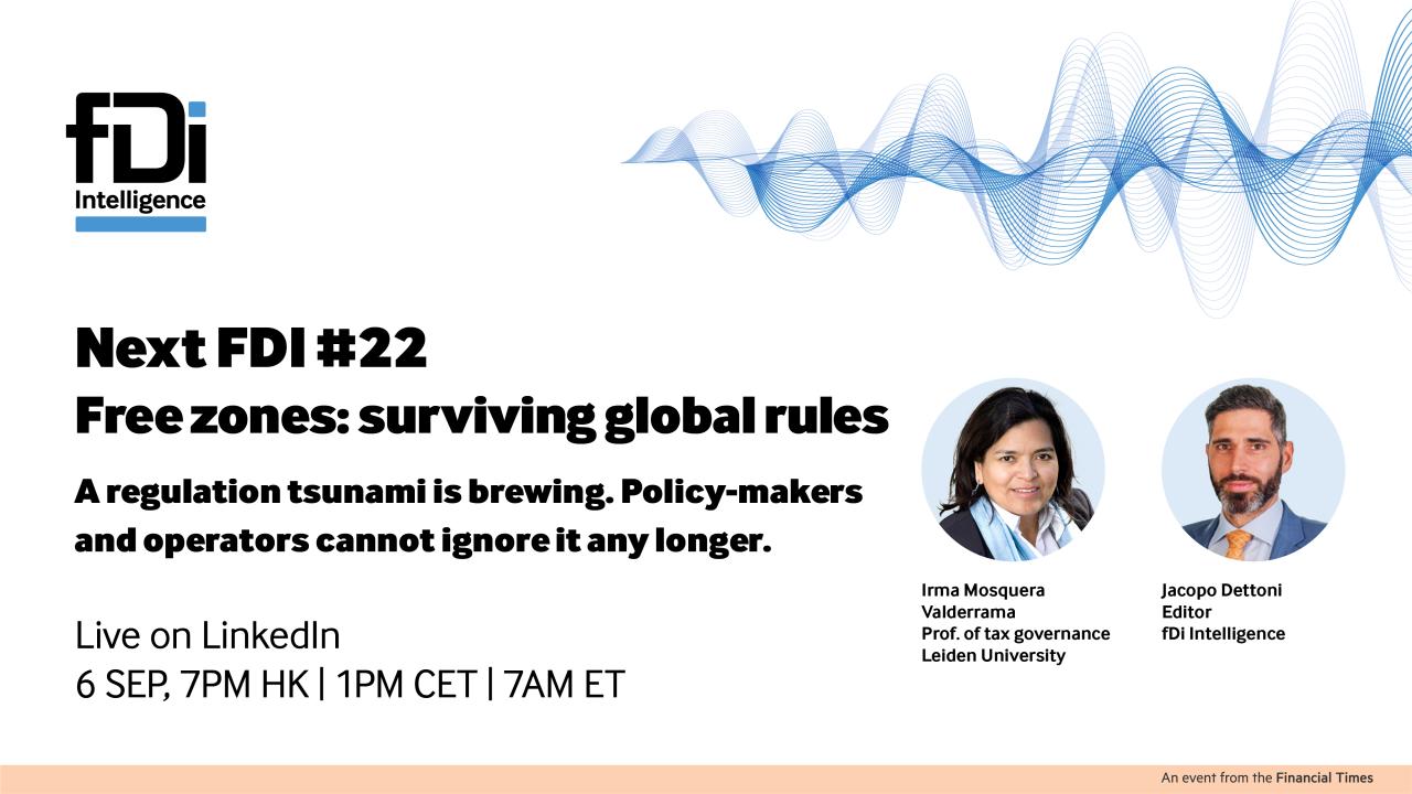 01/09/2022 Free zones: surviving global tax rules Calendar Add to Calendar Add to Timely Calendar Add to Google Add to Outlook Add to Apple Calendar Add to other calendar Export to XML When: 06/09/2022 @ 13:00 – 14:00 2022-09-06T13:00:00+02:00 2022-09-06T14:00:00+02:00 Where: Online Cost: Free Contact: FDI Intelligence Event website